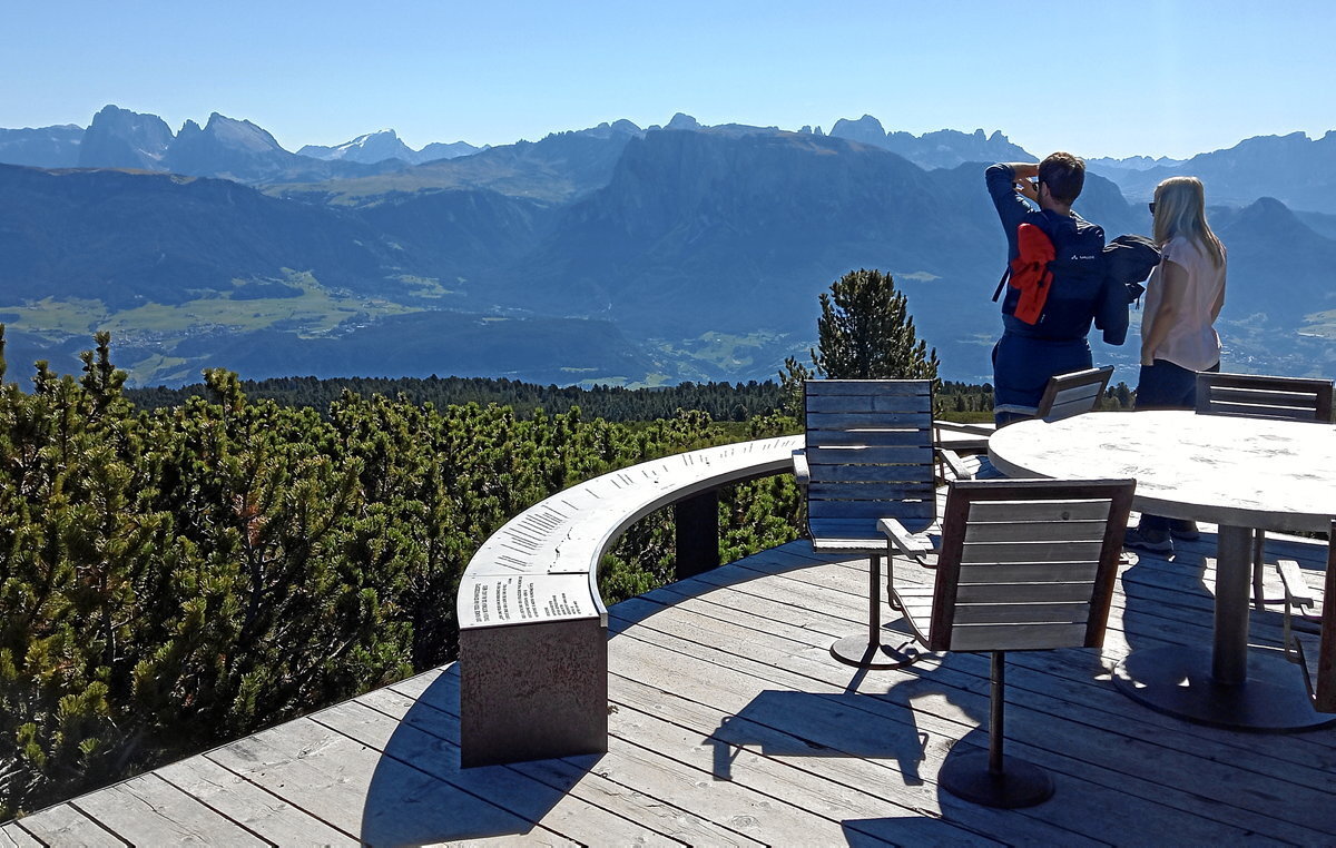 Beste aukera, oso ezaguna dena bestetik, mendiaren hegala inguratzen duena da, tontorrerako bidean jarri aurretik. Eguna oskarbi badago, eskaintzen dituen ikuspegiak zoragarriak dira. Ilunabarrean eguzkiak arrosaz tindatzen ditu Dolomitetako pareta bertikalak eta gailurrik garaienak: 2.414 metroko Santnerspitze eta 2.564 metroko Schlern. Urrutixeago, Marmolada (3.342 m) eta Langkofel (3.181 m) ikus daitezke ere.