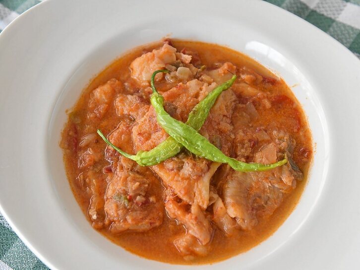 Lo primero es picar la verdura lo más fina posible: cebolla, pimiento verde y rojo. Dos cebollas y un pimiento de cada. Por otro lado, se pica una cabeza de ajos, entera, en láminas, y se inicia el guiso, rehogando este ajo en abundante aceite. Rehogadlo con el aceite frío e id calentándolo poco a poco. Os tiene que llevar mínimo diez minutos. Justo cuando empiece a coger color, añadid el resto de la verdura y rehogad el conjunto a fuego lento durante mínimo una hora y media. Mientras la verdura coge color, se coloca el bacalao (2 tajadas grandes) sin piel, cortado en dados pequeños, en una cazuela. Cubrid con aceite y confitad a fuego lento para que suelte toda la gelatina. En una olla aparte, elaborad un caldo de bacalao con las pieles, espinas y mucha, mucha verdura. Cuando las verduras hayan cogido color, se añade una cucharada de pulpa de choricero y se rehoga el conjunto, añadiendo un vaso de vino blanco. Cuando el vino haya reducido casi por completo, se añade el bacalao con toda la gelatina que haya soltado. Se remueve todo y se integra. Se deja 10 minutos a fuego medio. Seguido, se añade el caldo a pocos para que vaya reduciendo e integrándose todo junto. Se puede repetir este proceso tantas veces como queramos, para potenciar el guiso todo lo que queramos. Como opción extra, se puede añadir patata en dados, también en este mismo instante. Yo os recomiendo potenciar el guiso, mucho, y poner a punto de sal, justo al final. Como último toque, añadid un chorro de vinagre de vino blanco y, seguido, encima de este, un refrito clásico de ajos y guindilla. Esto os debería de llevar casi tres horas.