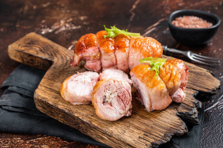 5. Rellenar la pechuga con el bacón, el queso y las nueces. Enrollarla y atarla con un hilo.