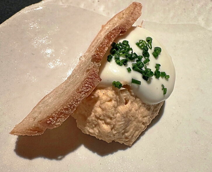 Empezamos con algunos bocados para comer con la mano. El primero, la tortita de kiskillas. Hay que pensar que parte de la cocina de Arima (el primer proyecto de Nagore y Rodrigo en Madrid) ha pasado por una de las mejores cocinas andaluzas a mi modo de ver (Bagá - Jaén) y que utilizan recursos más propios del sur en algunos casos, pero sin perder el norte. Brutal la tortita y espectacular la quisquilla que, en esta versión, va cruda y templada, aportando cremosidad al conjunto que os digo, acompañado de una copa de Izar Leku (espumoso de txakoli de Getaria elaborado por Artadi y Zapiain) de 10. Continuamos con la famosa gilda versionada que tanto ha dado a Arima y el buñuelo de morcilla de Beasain, alubia de Tolosa y berza. Este momento en la mesa, presentaba una estética perfecta. La madera quemada sobre la piedra, diferentes alturas y cada elemento perfectamente colocado en su soporte. Simplemente perfecto para el paladar y para la vista. ¡Qué gustazo más grande familia!