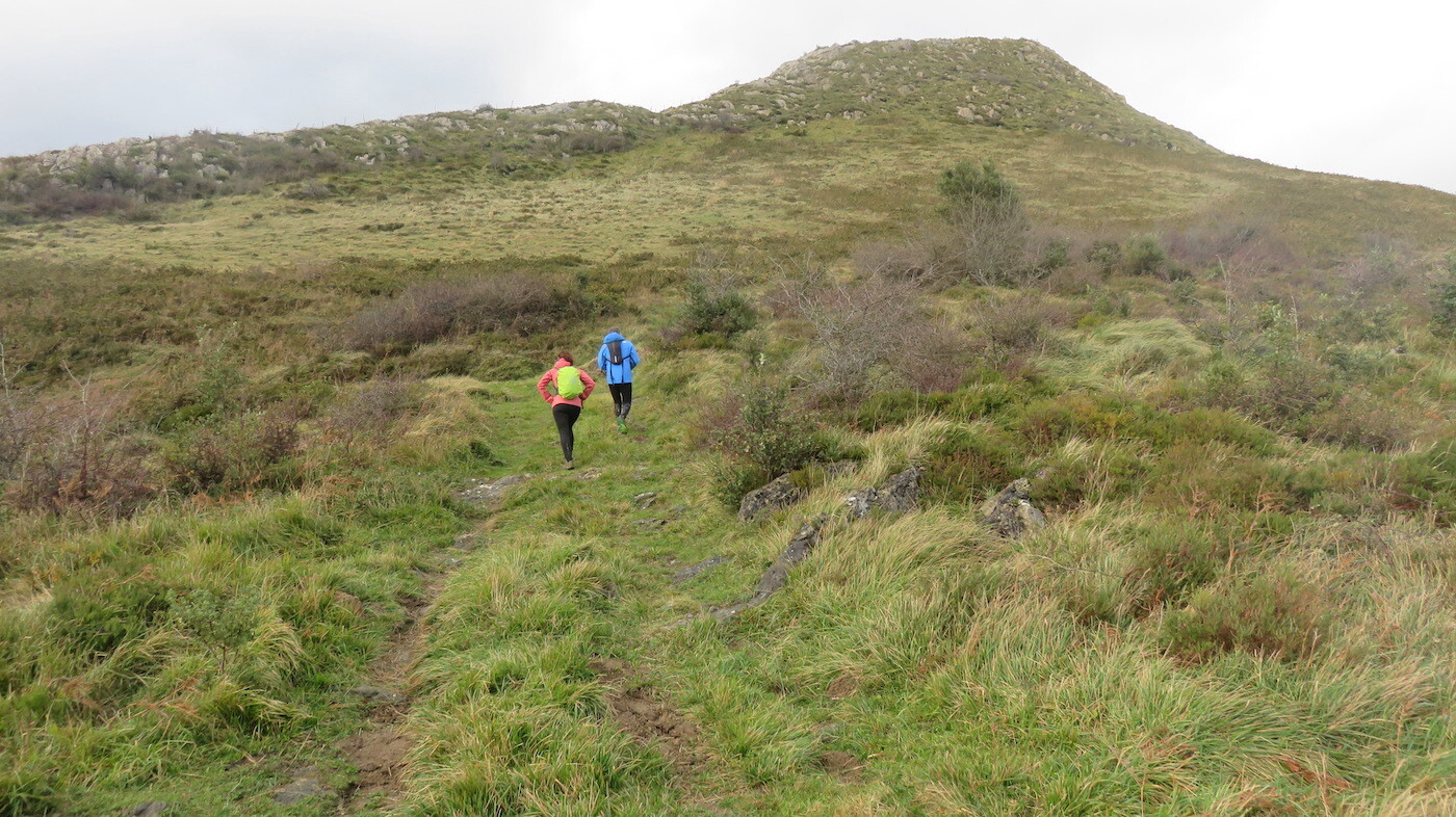 Mendi bideak eta bide zabalagoak tartekatzen dira igoeran, baina xendak sasiz inguratuta daude tarteka, eta adi-adi egon behar da bide egokiari jarraitzeko. Erreferentzia gisa Saltsamendi gailurra hartu behar da, gure iparrera. Erdi eraitsita dagoen baserri baten ondotik pasatuko gara, eta berau eskuinera utzita, pista on batean barrena Saltsamendi lepora iritsi. Ehiza postu bat dago bertan. Begi bistan izango dugu Saltsamendi gailurra, baina ordu laurdeneko azken ahalegina egin beharko dugu 590 metroko tontorrera iristeko. Tarteka besoak erabili beharko ditugu, inpultsoa hartzeko, baina ez dauka zailtasun handirik.