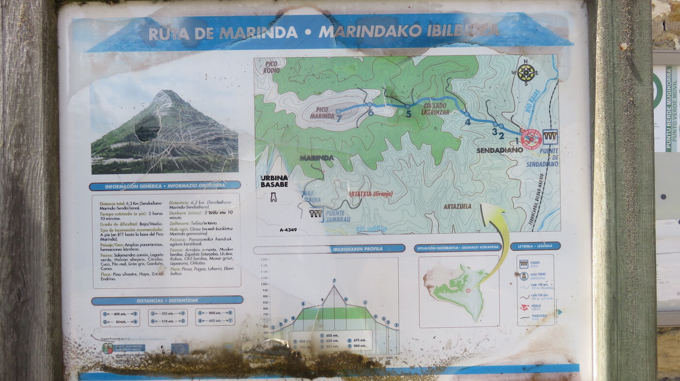 Han esaten denez, sei kilometro daude Marinda gailurrera, bi orduko bidea. Lasai joanda ere, nabarmen jaits daiteke denbora aurreikuspen hori, txangoa erosoa baita. Lehen erdia pista batean barrena egiten da. Tarteka malda pottoko batzuk gainditu behar dira, Larrinzar leporaino iristeko. Han arnasa pixka bat hartzeko aukera izango dugu, aurrez aurre Marinda tontorreko konoa azalduko zaigula.