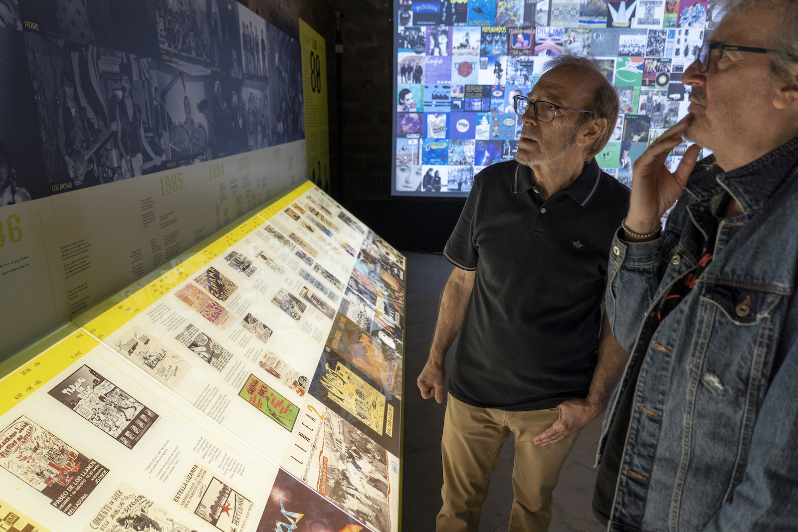 Dentro ya de la cripta, con el gigantesco mural lumínico compuesto por cientos de portadas de discos y la música ambiental de una lista de casi doscientos casetes y maquetas digitalizados para la ocasión, que solo puede oírse in situ (y a las que se suman tres listas de Spotify descargables con códigos QR, una por cada década, 60, 80 y 90.