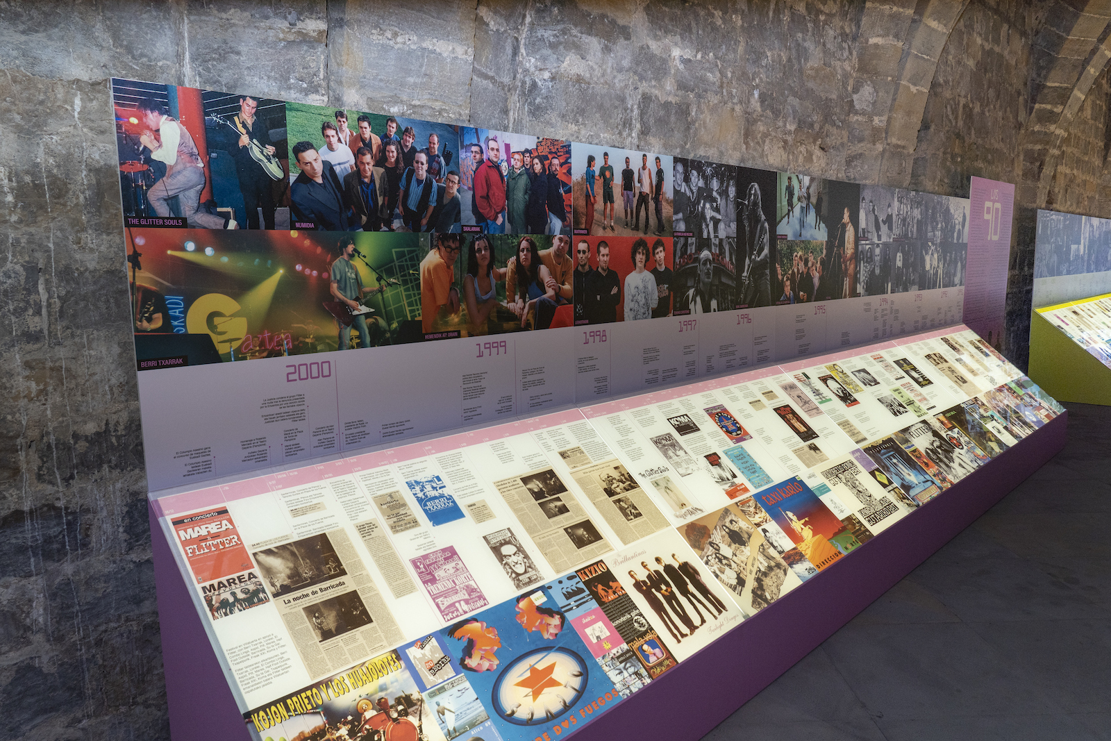 Bajamos a la cripta y nos recibe, antes de entrar en la exposición propiamente dicha, la recreación de un garito rockero, con su pequeño escenario y una pantalla de vídeo en la que se reproducen grabaciones, muchas de las cuales no es posible encontrarlas en YouTube o similares, como un concierto de Barricada a inicios de los 80 en el parque de Antonioutti, con la formación original: El Drogas, Boni, Sergio Osés y Mikel Astrain.