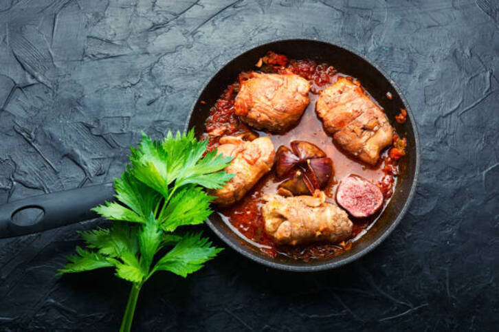 Untxi bat, 300 g piku, 2 tipula, 2 baratxuri ale, 200 ml ardo zuri, 400 ml salda, koilarakada bat ezti, olioa, gatza, ezkaia.