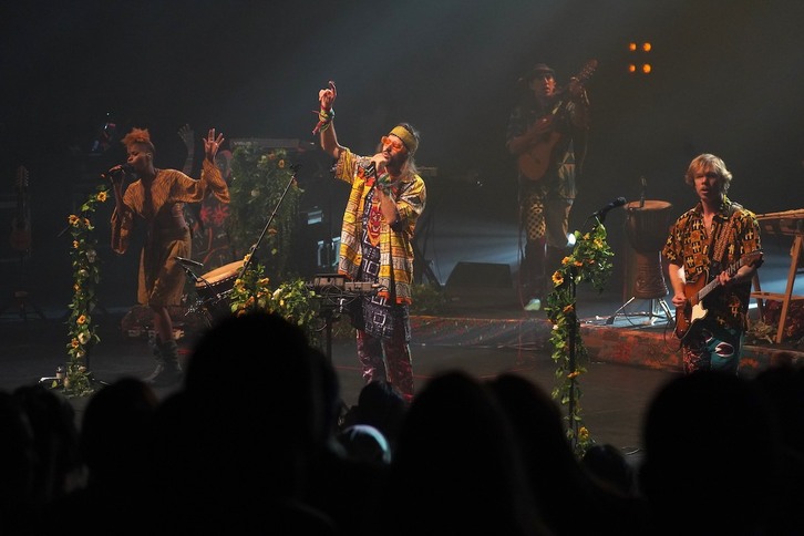 Una malaria contraída en Ghana por Sebastian Robert Lloyd Pringle, frontman de Crystal Fighters, aplazó su concierto donostiarra de febrero hasta anoche. Los británicos llevan meses presentando su quinto álbum ‘LIGHT+’, de 2023. Tras más de tres lustros de andadura, la banda original ha quedado reducida al dueto fundador de Pringle y Gilbert Vierich. Pero muy poco ha cambiado de su personalidad creativa porque en la nueva obra dicen recuperar su espíritu festivo, maltratado por el tiempo y la pandemia. Y para que quede claro, la portada del nuevo disco vuelve a hacer un guiño a la estética carnavalera navarra.