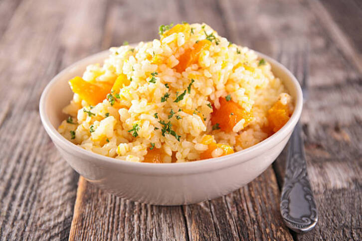 300 g arroz, azenario bat, 3 baratxuri ale, 300 g kuia, piper berde bat, 150 g ganba, 1,5 litro salda, olioa, gatza.
