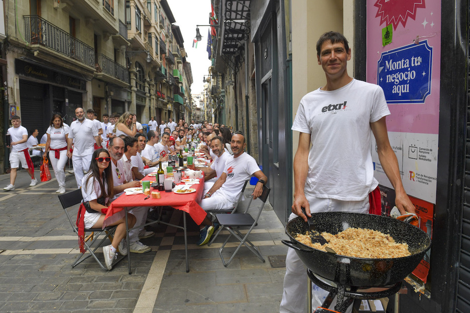La jornada ha arrancado con una temperatura agradable de 21 grados y sin que la lluvia haya venido a perturbar la cita. En las horas previas al lanzamiento del cohete, largas mesas aparecían distribuidas por sus calles para albergar a unos comensales ansiosos por llenar la tripa antes de que arrancasen los sanfermines de 2025.