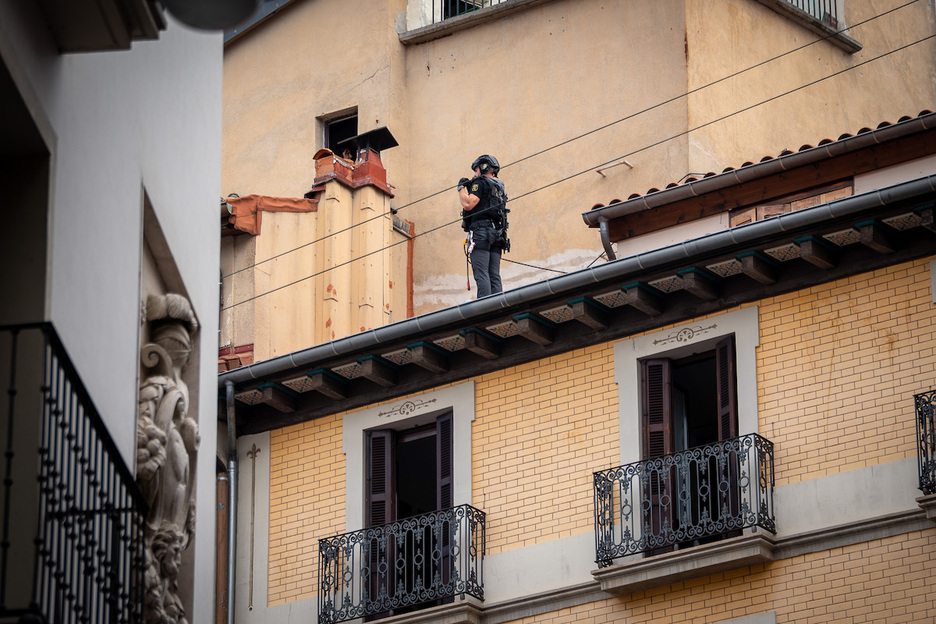 Un policía, en uno de los tejados de la plaza Consistorial durante el txupinazo. (Aitor KARASATORRE | FOKU)