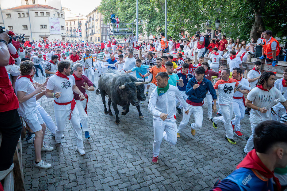 Hasta ese momento final, eso que los expertos llaman ‘nobleza’ de los toros ha impedido males mayores. Para empezar, en el ‘túnel’ de Santo Domingo un corredor ha caído y ha sido pisoteado por toda la manada. En Estafeta no han faltado imprudencias humanas a las que los bureles no han atendido. Ya en Telefónica, un Escolar ha caído pero se ha reincorporado con rapidez. Y en la Plaza de Toros se han producido los momentos más inquietantes.