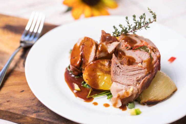 Atera eta xerratan moztu. Saltsarekin eta patata purearekin lagundu.