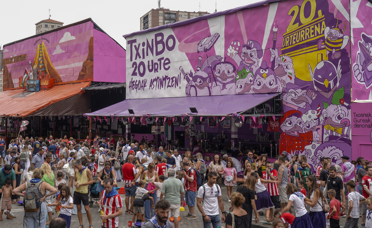 Betaurreko arrosak jantzita eramatearen sentipena eragitea lortu dute aurten Bilboko Konpartsek. Denek ala denek kolore hori dute dekorazioaren oinarri 2025eko Aste Nagusian. Izan ere, zer lirateke Bilboko txosnak aldarrikapenik gabe? Imajinatze hutsa ere ezinezkoa da.
