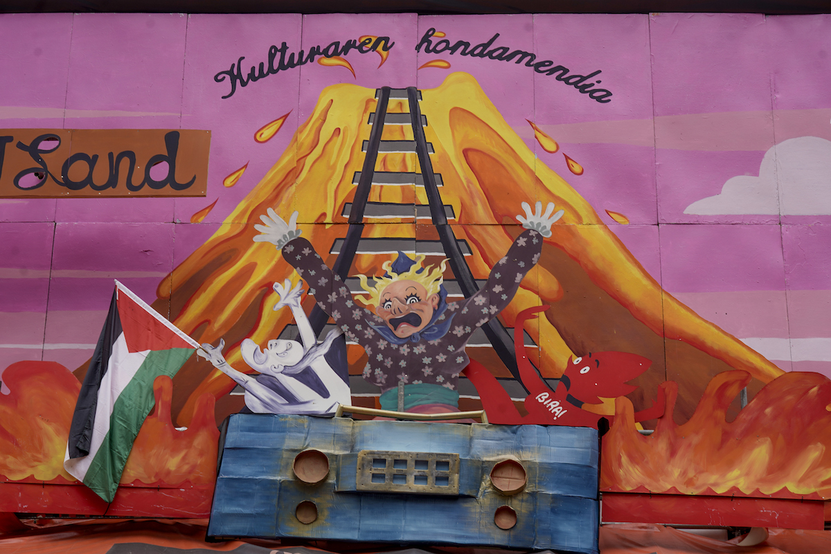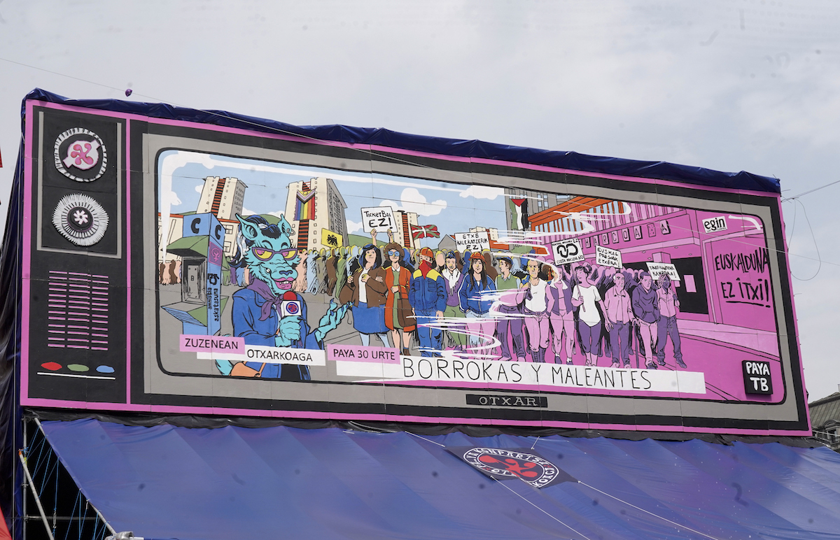 Arriagara bueltako bidean, Triangunen, Bizizaleek kutsadurak izorratutako etorkizun distopikoa irudikatu dute. Eta Mekauenek komiki formatua baliatu du mezua helarazteko. Halaber, konpartsa internazionalistak plataforma deigarria prestatu du, animal print estanpatuaren erdian Netanyahu bera marraztuta. Gune berean, Sinkuartelen gaia bermilitarizazioa izan da, eta haren ondorioak itxuratu dituzte txosnaren apainketan.
