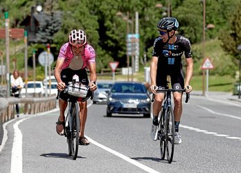 Lachlan Morton, acompañado del corredor del DSM Chris Hamilton, a su paso por Andorra en sandalias. (Valentine Chapuis / AFP)