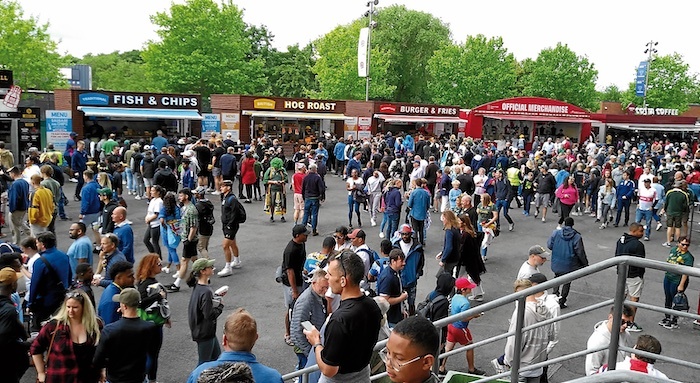 Enseguida se despeja la duda. En el interior venden cerveza, rubia y negra, por unas siete libras la pinta de medio litro. Unos 8,4 euros al cambio. Todo apunta a que el motivo de la incautación es económico. Esto es una máquina de hacer pasta. Hay numerosos ‘food trucks’ con salchichas, hamburguesas y otras clases de comida rápida. Los tres chavales que pasarán la jornada sentados a nuestra derecha se van a dejar fácil unas 40 libras por barba.