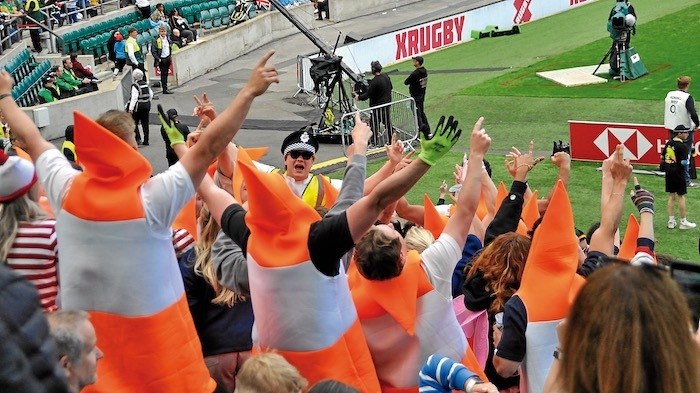 Al ritmo de “Sweet Caroline”. El Seven es una fiesta en la grada. Partidos divididos en dos partes de siete minutos, uno detrás de otro, y los tiempos muertos amenizados por un DJ. «Sweet Caroline –‘pa, pa, pa’–, good times never seemed so good», canta Neil Diamond. «So good, so good, so good», corea el pueblo. Hay canciones para las que no pasa el tiempo. Si alguien busca a Wally, aquí tenemos a una cuadrilla de 20 personas vestidas con rayas horizontales rojas y blancas. Otros han optado por disfrazarse de conos de tráfico. Todos mezclados y con muy buen rollo gane quien gane.