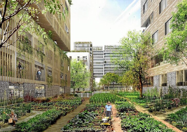 Árboles y agricultura contra el calor. Pero tal vez el elemento más llamativo del nuevo desarrollo urbano es el diseño de un verdadero paisaje productivo. Se han destinado 25.000m2, tanto en los centros de manzana como en las cubiertas de todos los edificios a construir, a la agricultura urbana profesionalizada. El espacio público ofrece tierra para favorecer el crecimiento de los árboles frutales a colocar y de las zonas agrícolas. Más allá de la producción de alimentos, esta estrategia favorece la lucha contra el efecto la isla de calor. De esta manera se recupera la memoria del lugar, ya que antiguamente una parte importante de los terrenos sobre los que se configura el nuevo barrio estaba destinado al cultivo de flores para todos los hospitales de París, así como a huertos cultivados por el horticultor Ms. Truillot.