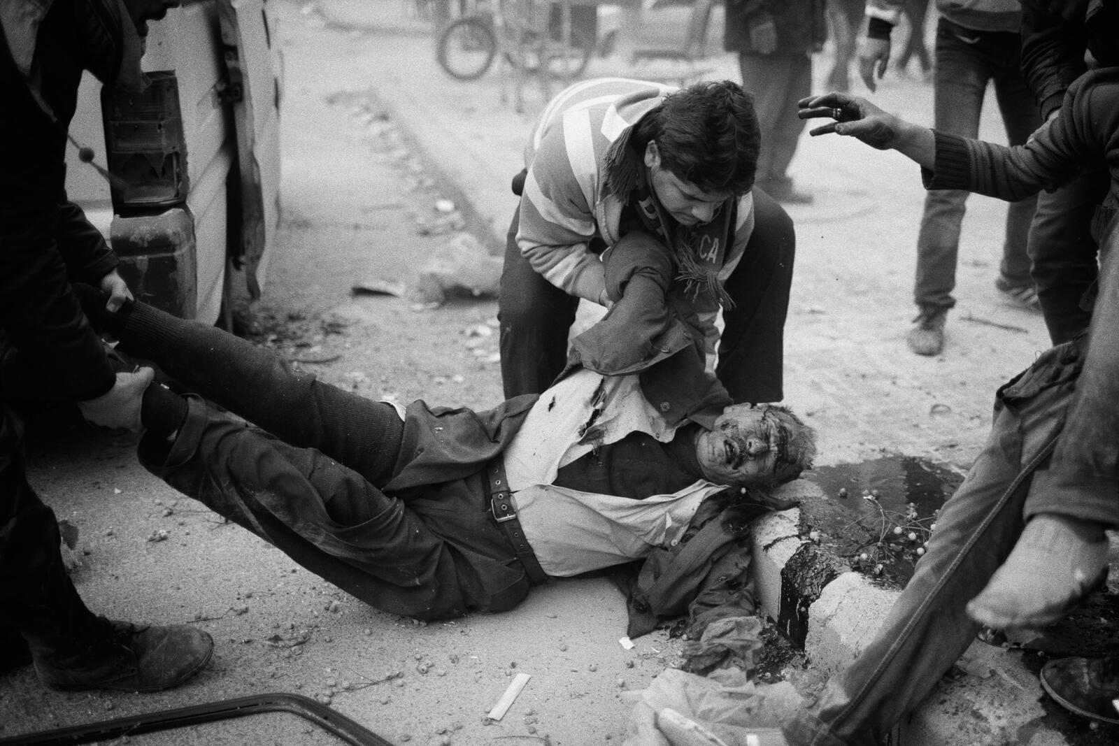 Un civil tirado en el suelo tras recibir el impacto de un mortero en el barrio de Izaah en Alepo, el miércoles 13 de enero de 2013. En la imagen que abre este reportaje, se aprecia el estado actual de esa misma calle donde ocurrieron los hechos. Andoni Lubaki
