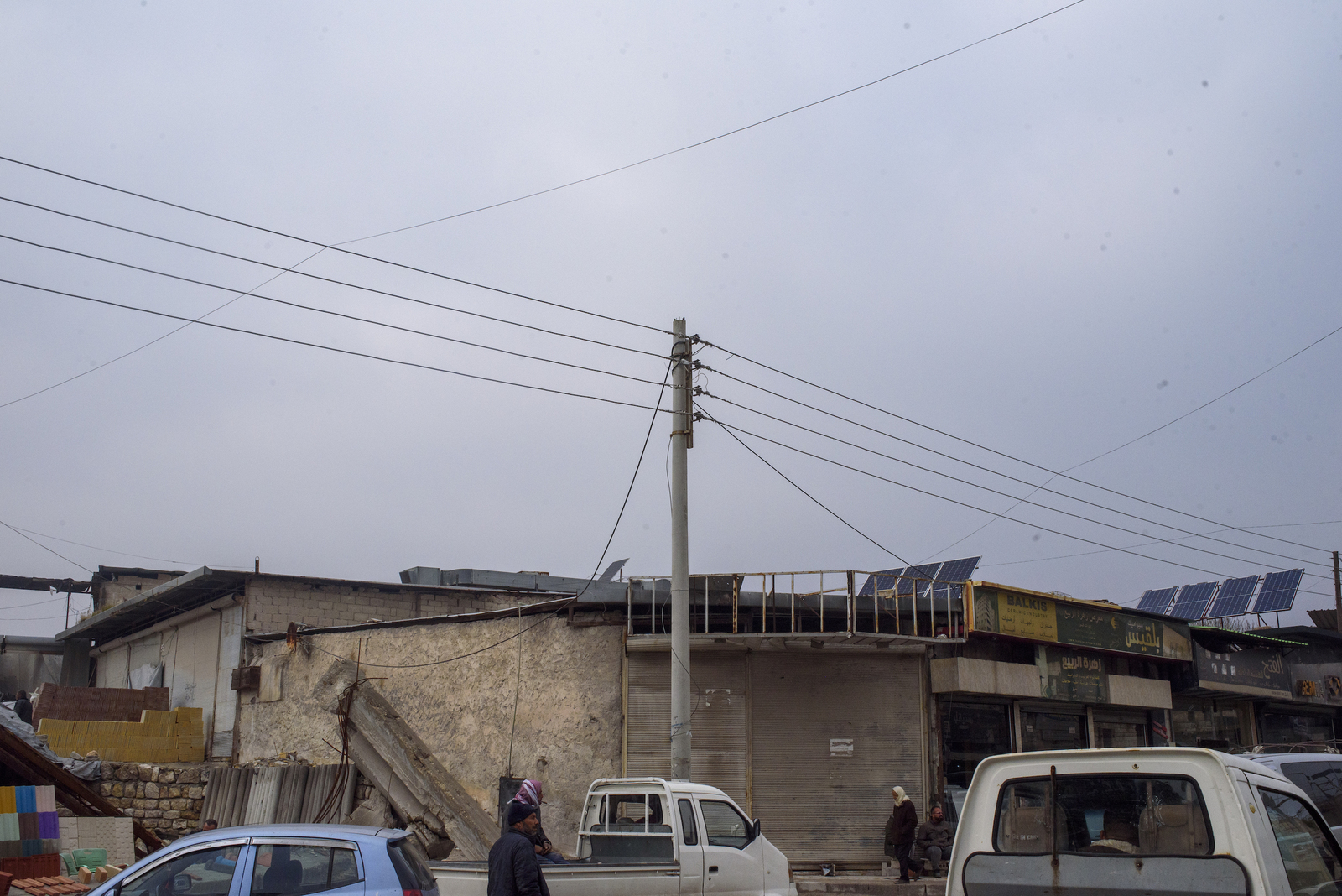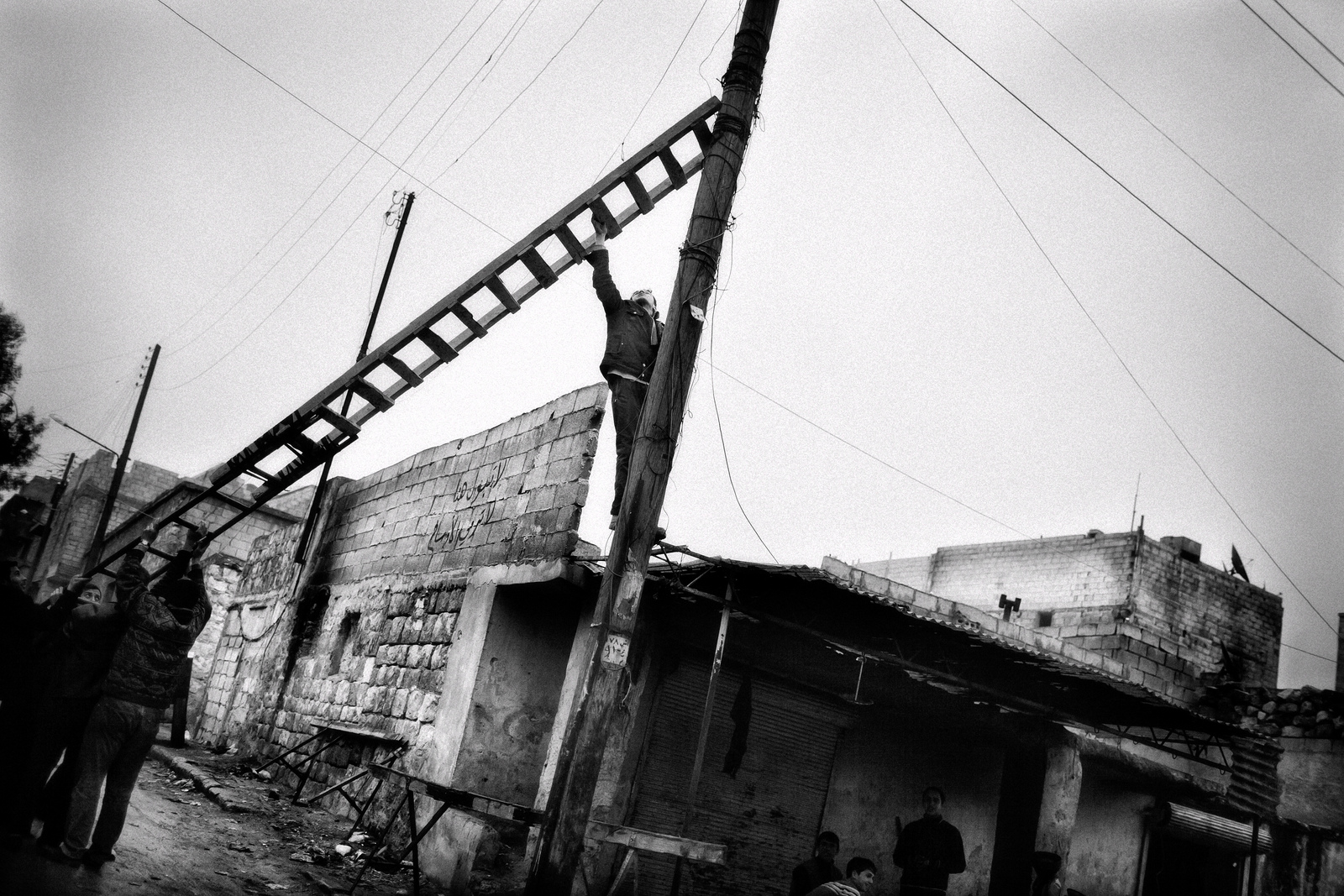 Un hombre intenta conectar un cable con un líder en Alepo el 5 de enero de 2013. Hoy en día, como se aprecia en la fotografía superior, ese poste del cableado eléctrico sigue en pie. Andoni Lubaki
