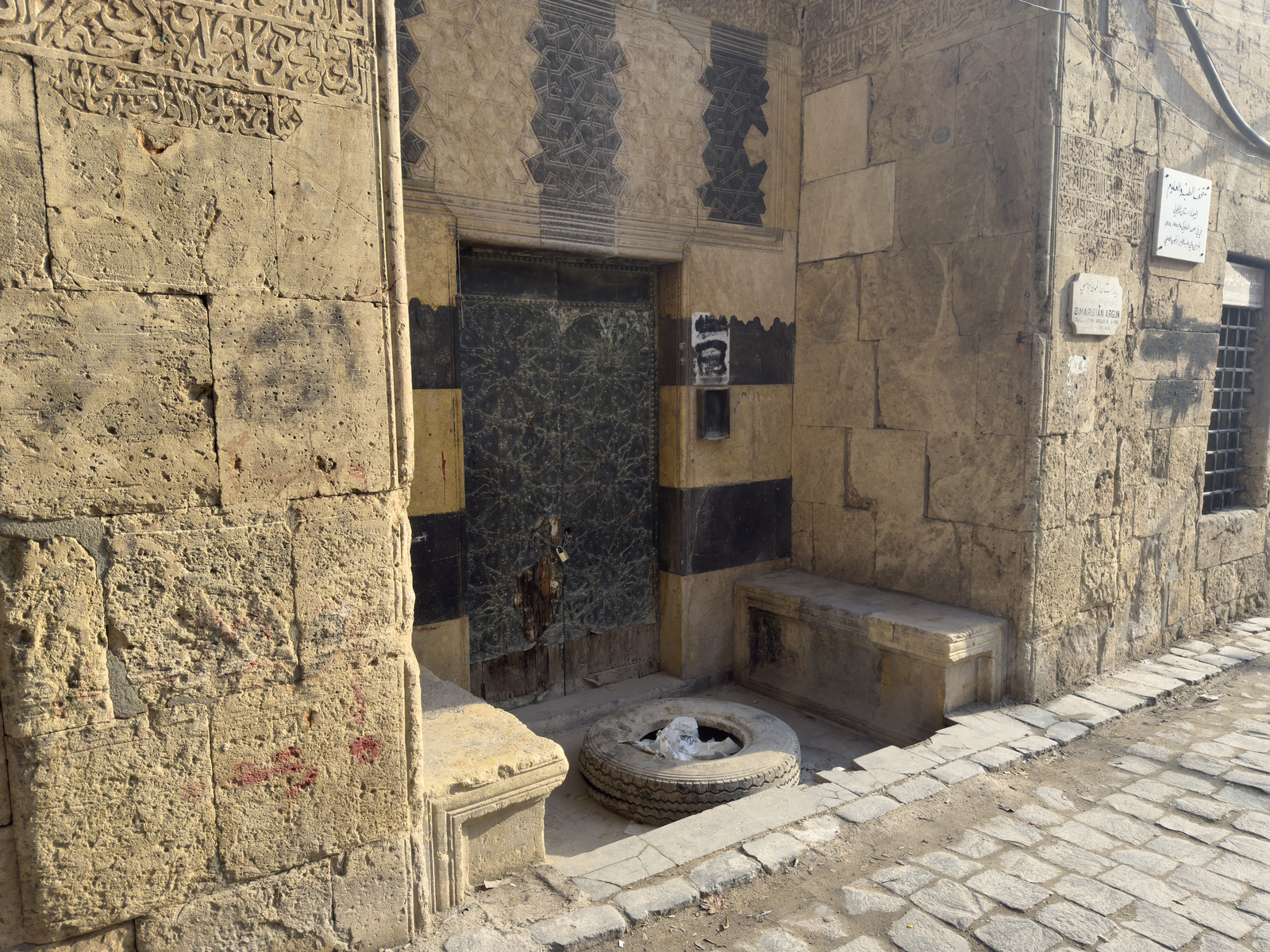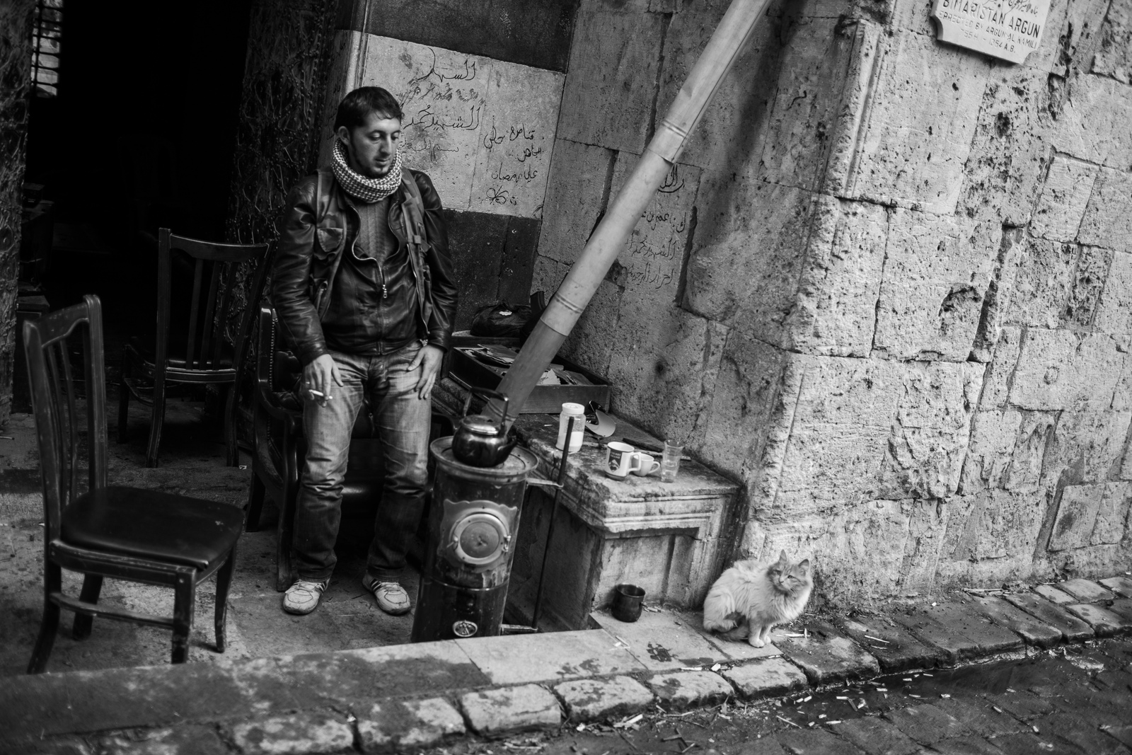 Un rebelde islamista sirio da de comer a un gato en el barrio de la Ciudad Vieja de Alepo, el 6 de enero de 2013. En la fotografía actual se ve que aún permanece el rastro de la guerra, ya que el edificio junto al arco está totalmente destruido. Andoni Lubaki