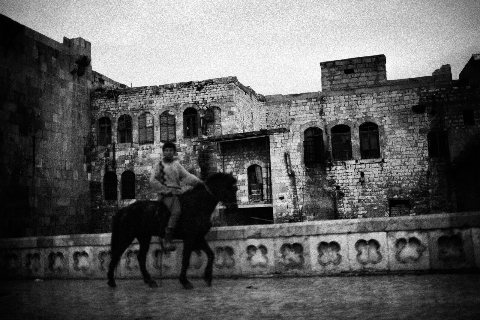 Un niño montando a caballo cerca del frente de la Ciudad Vieja de Alepo. En el mismo petril de la ciudad siria se sientan ahora tres miembros de una familia que encara un futuro marcado por las secuelas de la guerra. Andoni Lubaki