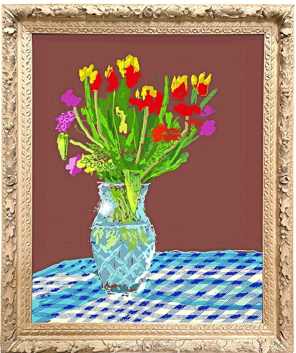 «David Hockney 4th February 2021, Red, Yellow and Purple Flowers on a Blue Tablecloth, 2021», (70 x 55 cm). (© David Hockney, Fundación Louis Vuitton).