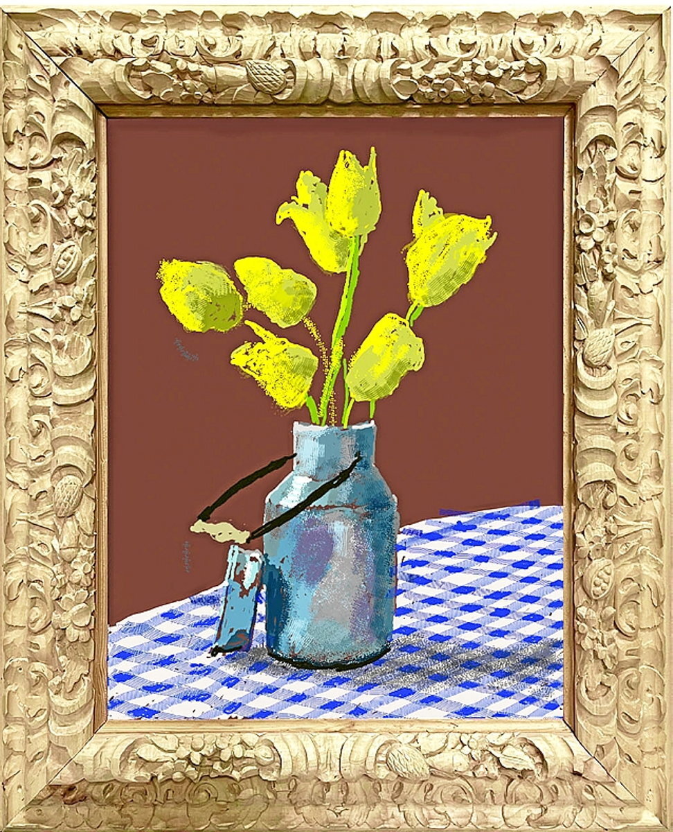 Retratos de flores, cuadros para iPad impreso en papel, montados sobre aluminio: «David Hockney 21st April 2021, Yellow Flowers in a Small Milk Churn, 2021», (70 x 56 cm). (© David Hockney, Fundación Louis Vuitton)