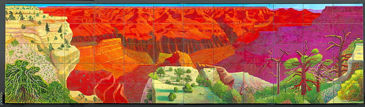 «David Hockney, A Bigger Grand Canyon, 1998», el Gran Cañón en diversos momentos del día. Está compuesto por 60 pequeños lienzos que forman la imagen grande (207 x 744,2 cm). Hockney lo pintó en 1998 y, un año después, la Galería Nacional de Australia lo adquirió por 4,6 millones de dólares. (© David Hockney | Cortesía de National Gallery of Australia)