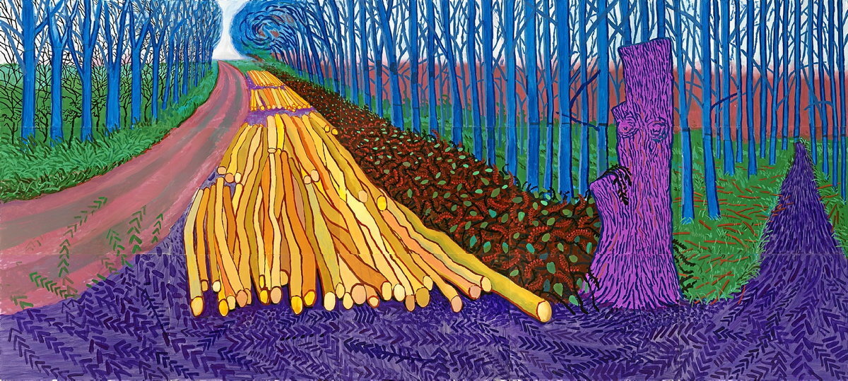 «David Hockney, Winter Timber, 2009». Óleo sobre quince lienzos (274,3 x 609,6 cm conjunto). El autor pinta estos troncos in situ en Yorkshire, cerca de su lugar de nacimiento. (© David Hockney, © Jonathan Wilkinson, Fundación Louis Vuitton)