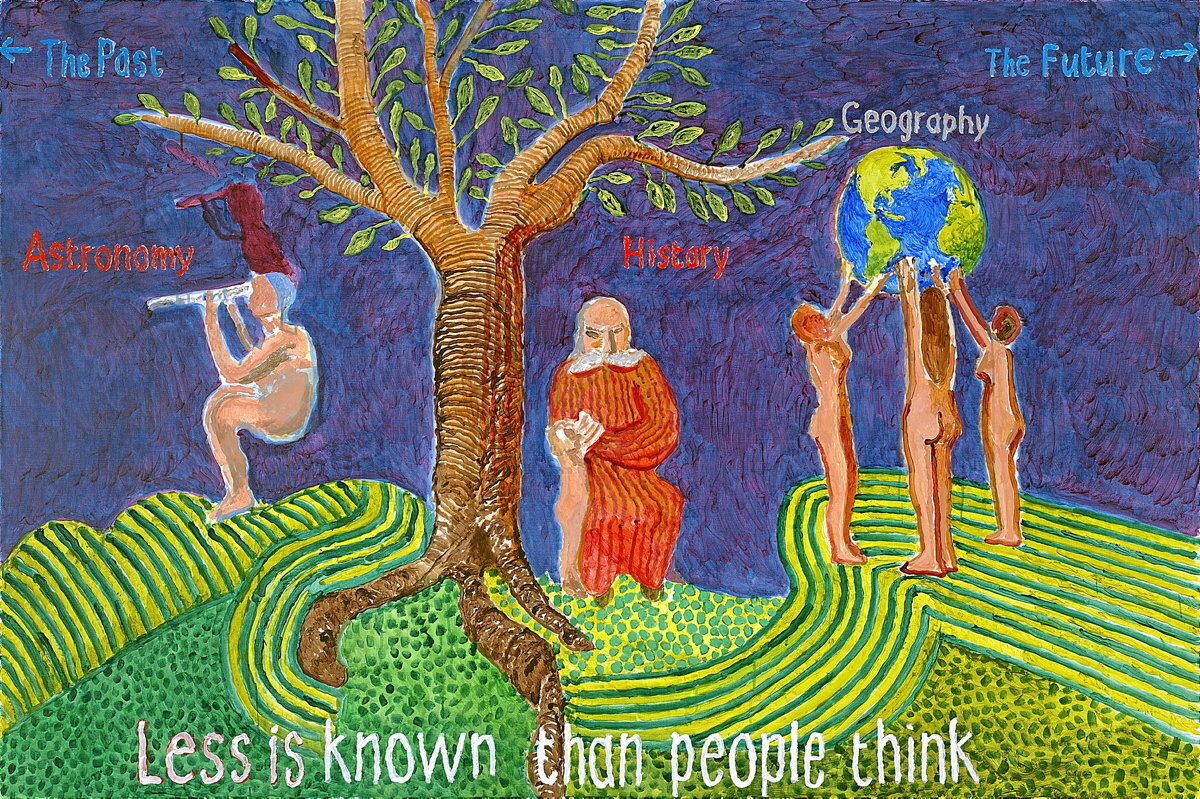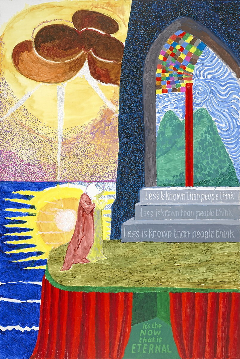 «David Hockney, After Munch: Less is Known than People Think, 2023», acrílico sobre lienzo (121,9 x 182,9 cm) en el que plasma una frase que repartía a sus amigos: «Se sabe menos de lo que la gente piensa». (© David Hockney © Jonathan Wilkinson | Fundación Louis Vuitton)