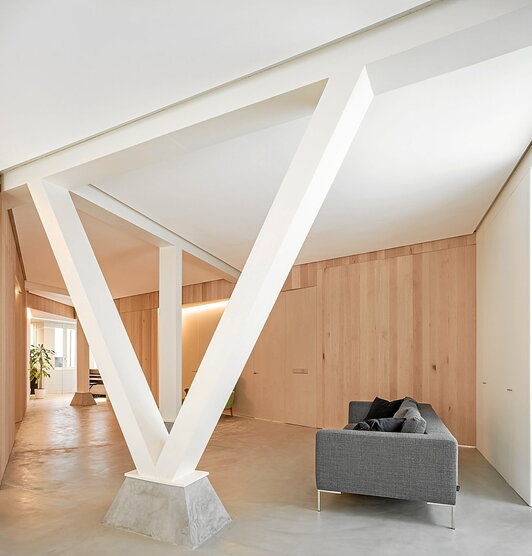 Banaketa edo antolamendu berriak jatorrizko egituraren logika erretikularrarekin talka egiten zuen, baina RUE arkitektura bulegoko kideentzat hori ez zen arazo, erronka baizik. Soluzioa adreiluzko karga-hormak ordezkatuko zituzten portiko metalikoak txertatzea izan zen, goitik zetozen kargak beheko sostengu puntuetara transmititzeko gaitasuna zutenak. Entramatuaren puntu kritikoetara egokitzeko beharrak egitura berriari T, T eta V hizkien itxura eman zion, ikuspuntuaren arabera irakur ditzakegunak, eta azkenean proiektuari izena eman diotenak.