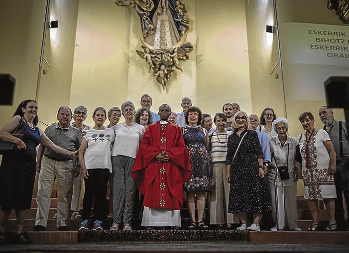 Mientras transcurre la misa, con dos figuras gigantes sobre las paredes de San Ignacio de Loyola y de San Prudencio, aparecen en las paredes diapositivas con la letra de canciones en euskara, mientras el pianista acompaña. «Eskerrik asko, Jauna bihotz bihotzetik, eskerrik asko, Jauna, orain eta beti», cantan los fieles. Tres siglos y una década después, con dictaduras, incendios y pérdidas en medio, esta comunidad en el corazón de Madrid lucha por mantener viva su llama.