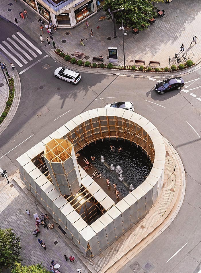 Muturreko beroari aurre egiteko helburuarekin bi instalazio iragankor kokatu dira, uraren eta herritarren parte-hartzearen bidez espazio publikoaren erabilera birpentsatzeko. “Monumental Splash” (SalazarSequeroMedina) instalazioak Esparteroren Iturria aldi baterako igerileku publiko bihurtzen du, oasi irisgarria, ludikoa eta inklusiboa sortuz. Esku-hartzeak hirien erdigunean gune freskagarrien beharra nabarmentzen du. Instalazioak urarekiko interakzio zuzena sustatzen du, krisi klimatikoaren aurrean duen balioa ikusaraziz. Aldamio eta panel berrerabilgarriz osatutako egitura zirkularrak monumentuen rol estatikoa zalantzan jartzen du, herritarren egungo beharretara egokitzea proposatuz. “Round about Baths” (Leopold Banchini Architects) proiektuak, berriz, normalean iritsezina den biribilgune bat komun publiko bihurtzen du. Higienea eskubidetzat defendatzen zuten XIX. mendeko gizarte-mugimenduetan oinarrituta, instalazioak aldagela, lurruna eta ur hotza ditu, eta intimitatea eskaintzen du hirigune zalapartatsuan. Zurezko egiturak ahazturiko espazioen potentziala agerian uzten du, eta hura zer izan litekeen hausnartzen du. Aldi baterako bi azpiegiturek, berrerabilgarri eta kostu txikikoek, eguneroko esperientzia eraldatzailea bilakatzen dute.