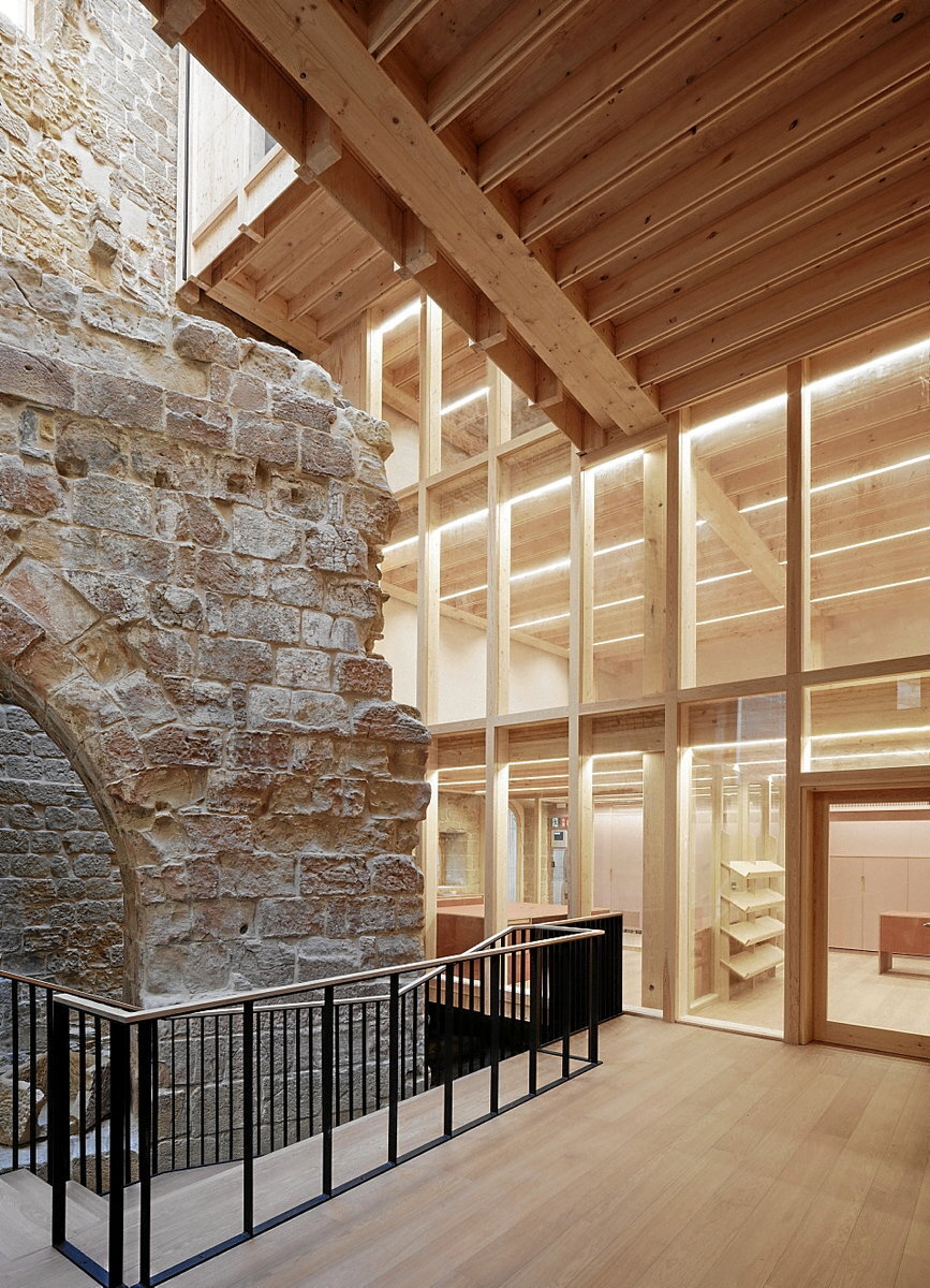 Eraikineko protagonista nagusiak, ordea, honen fatxadak eta bere hutsuneak bihurtu dira. Hutsune hauek, guztiak ezberdinak, XX. mendean adreiluz eta zementu morteroz estaliak izan ziren, hormen egonkortasuna bermatzeko. Irudi zaharrei esker bagenekien hauetako batzuk desitxuratuta zeudela eta adreiluak kentzen ahaleginduz gero gehiago apurtzeko arriskua zegoela. Horren aurrean, bi estrategia bide hartu ziren: irekitzen ez ziren hutsuneetan, adreilu-oihalak kare-morteroz estali eta gainean metalezko plaka beheratu bat jarri zitzaien, bertan existitu zela dokumentatua zegoen hutsunearen irudi abstraktu bat lortuz. Irekitzen zirenen kasuan, adreilu zatiak kendu, harrizko egitura berreraiki, eta marko metaliko autosostengatu bat egin zitzaien, harria ukitu gabe, forma aldakorretara egokitzen zena. Horrela, fatxada narratibo bihurtzen da, garai ezberdinen hainbat irakurketa modu didaktikoan gainjarriz.