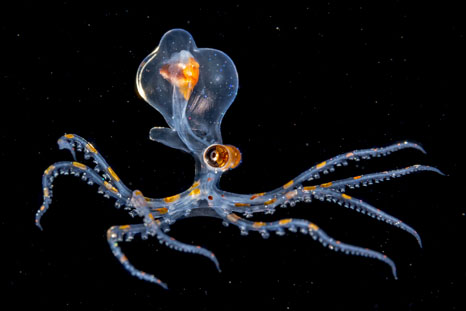 Tahitiko kostaldeko ur sakonetan ordu asko ematen ditu urpeko igeriketa egiten. Gau batean, 20 metrora olagarro gazte batzuekin egin zuen topo. Gorputza gardena dute, kamuflaje gisa.
