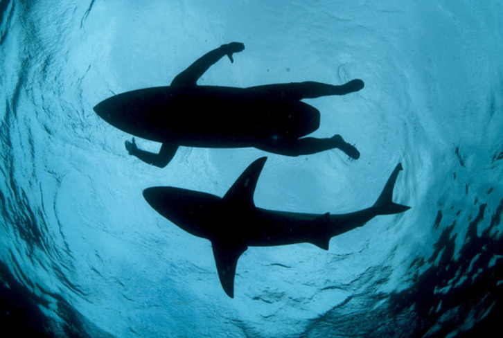 Marrazoen erasoen arriskua uste baino txikiagoa da –iaz 73 eraso zenbatu zituzten mundu osoan; horietatik 3 hildakoekin–, baina beldurrak hor dirau. Hegoafrikako Aliwan Shoal gunean, uhin elektromagnetikoen bitartez marrazoak uxatzen dituen surf taula baten prototipoaren probetan ateratako irudi honekin surflarien eta marrazoen arteko bizikidetasun baketsua islatu nahi izan zuen egileak.
