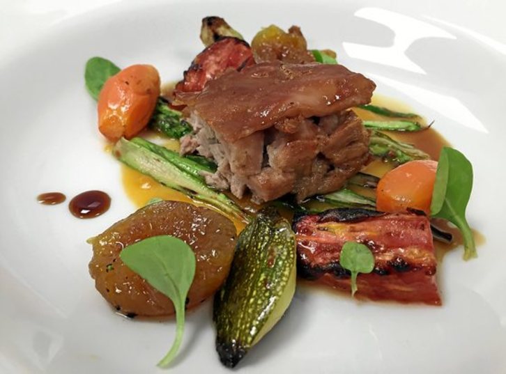 Cochinillo confitado a baja temperatura con verduras de la huerta