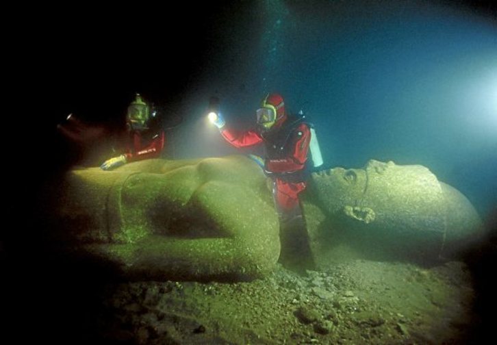 Bajo las aguas de la bahía de Abukir, en Egipto, se encuentra uno de los mayores yacimientos arqueológicos de la antigüedad. A ocho metros de profundidad surgen los restos de las ciudades de Heraclion y Canopus, descubiertas en el año 2000 y escenario de una serie de excavaciones submarinas que han sacado a la luz miles de objetos de los antiguos egipcios, algunos de los cuales se pueden contemplar en una exposición en París.