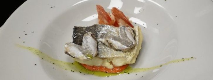 Merluza confitada en aceite de ajos sobre crema de piquillos y gambas fritas