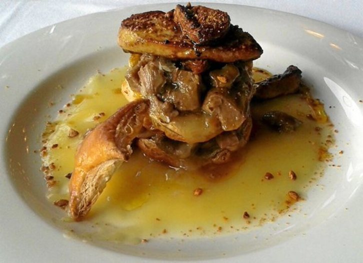 Milhojas de onddo beltza sobre espuma de manzana y foie a la sartén