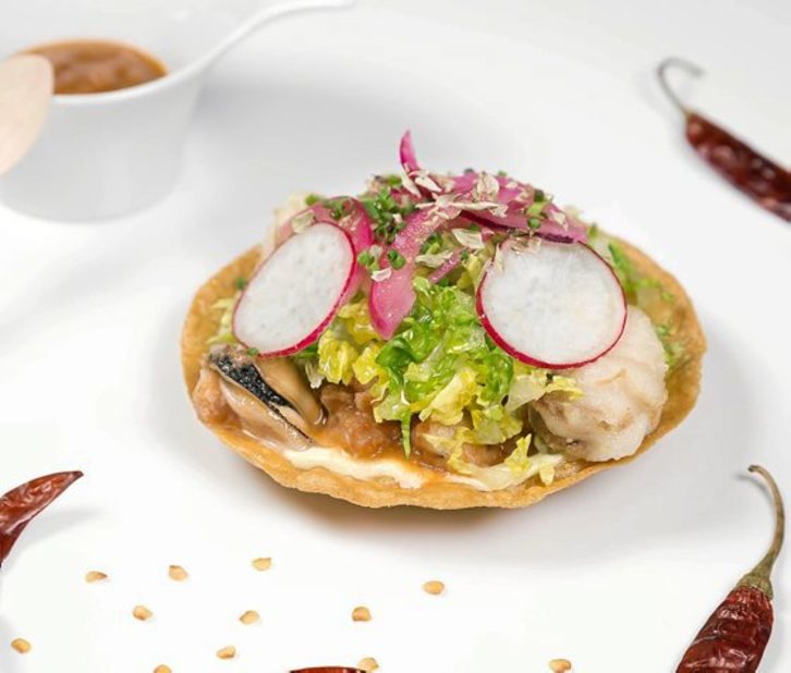 Tostada de maíz con marisco y salsa roja
