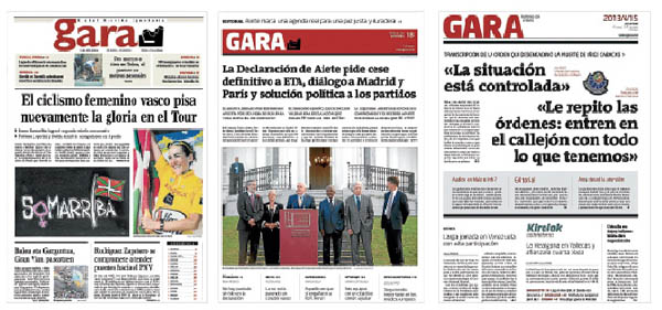 El libro es una compilación de portadas de los tres periódicos, que van en orden cronológico desde el primer ejemplar de “Egin” en setiembre de 1977, hasta la primera página que recoge la sentencia contra los responsables políticos independentistas catalanes el pasado mes de octubre en GARA. Sin pasar por alto ese paréntesis épico de seis meses que supuso “Euskadi Información” entre ambos medios tras el traumático cierre judicial del primero.