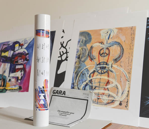 Quienes se acerquen a GARA durante la Feria de Durango, además de publicaciones, encontrarán también otros productos editados el presente año con motivo de la campaña para hacer frente al #ExpolioGARA: las nueve láminas artísticas realizadas por otros tantos pintores vascos, cuyos ejemplares podrán contemplarse en el propio stand.