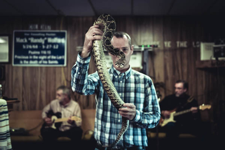 Elegidas previamente por Chris en su sótano, transformado en un vivero de estos reptiles, a las protagonistas del acto religioso se le pueden añadir algunas traídas por los propios feligreses. Hay principalmente serpientes de montaña autóctonas, cazadas por los manipuladores, y se pueden encontrar serpientes cascabel de bosque y cantil cobrizo norteño (Agkistrodon contortrix), ambas especies obviamente mortales.