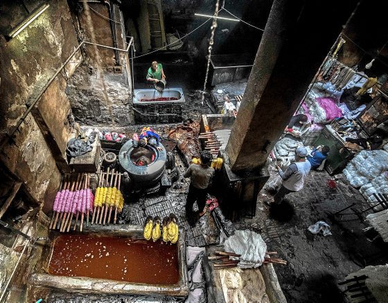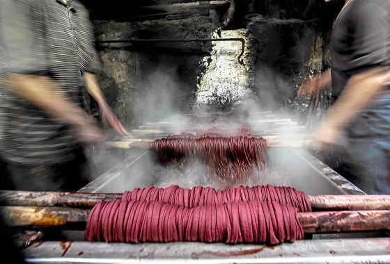 En una atmósfera bañada de vapor, los operarios de este taller extienden largas filas de hilos de algodón, las suspenden sobre perchas y las dejan remojar en grandes bañeras llenas de agua y tinte.