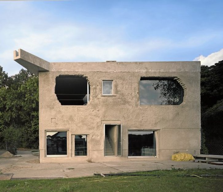 Estas grandes aberturas expresan la presencia física de la estructura original, y le otorgan esa identidad de ruina industrial abandonada. Inspirados por la película experimental de Claude Faraldo, “Themroc” del año 1973, en la que el protagonista experimenta un cambio vital que le llevará maza en mano a derribar muros y abrir ventanas nuevas en su casa, se perforaron esos grandes agujeros en las paredes que dan al lago y al bosque, reemplazando las ventanas existentes en esas fachadas, para obtener la máxima apertura y exposición al paisaje.