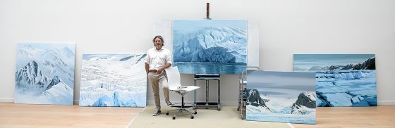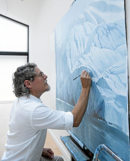 Es lo mismo que me ha pasado ahora con el Ártico, mi curiosidad me llevaba cada vez a paisajes más fríos, más blancos, con ausencia de color. Para poder pintar esos glaciares, esos icebergs, como dices, podría descargarme miles de fotos que están colgadas en internet, pero son imágenes planas, no cuentan nada, no hay una vivencia detrás salvo para quien la hizo, y de ahí mi interés de ir al Ártico, verlo presencialmente, dibujarlo teniéndolo de frente, sentir el frío, cruzarme con otros artistas con diferentes visiones frente a un mismo acontecimiento. Toda esa experiencia in situ, es la que luego te da fuerza y energía para ir quitando esas capas, ahondando, hundiéndote en esa estratigrafía. No es solo hielo, no es solo un glaciar, son las historias que esconde, la de la exploración, las vicisitudes que vivieron los primeros habitantes, los pescadores vascos que estuvieron allí. Es un cruce de diferentes miradas.
