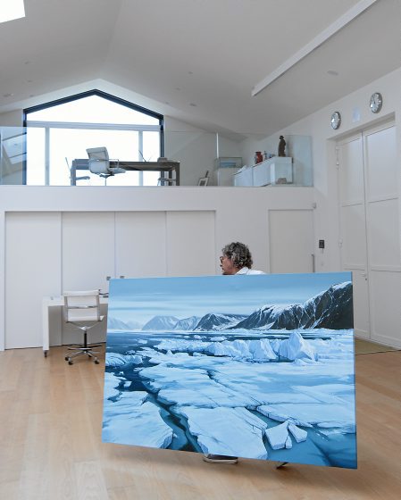 Tengo que mirarlo. Tengo que ir todos los días a mirarlo, ser consciente de lo que tengo alrededor, dibujarlo, hacer acuarelas, fotografiarlo, estar fijándome en lo que le ocurre, porque si no, soy incapaz de imaginar una nube. Y te digo el cielo, como te digo una montaña, el paisaje, el mar o el Ártico, tengo que involucrarme físicamente, y esa relación te permite, al menos a mí, poder jugar luego con los materiales que he extraído de esa experiencia. Si eso lo hago a través de imágenes que he descargado de internet, pues probablemente, aunque yo tenga bastante habilidad para representar cosas, serían imágenes muy apagadas, muy planas, sin fondo. Esa profundidad de la imagen a la que aspiro tiene que estar incluso antes de que la idea haya surgido, me tiene que pillar antes. Hay que pasar frío, hay que levantarse pronto, hay que mojarse, vincularte emocionalmente con los temas que trabajas. Así igual consigues algo, pero si no lo haces es seguro que se van a convertir en imágenes que no van a decir nada.