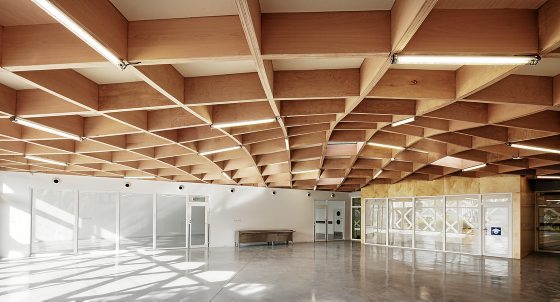 Este patio se cubre utilizando un emparrillado de vigas de doble dirección de madera laminada. Mediante este sistema se consigue, usando un material bastante más sostenible y con una huella de carbono mucho más baja que el acero, reducir drásticamente el número de soportes necesarios, dar una imagen continua al espacio y, cosa de vital importancia en un patio de colegio, la irregularidad de los casetos hace que la reverberación del espacio, el “eco” que existe, sea muy pequeña, algo que cualquier persona que haya tenido que hacer labores de cuidados en, pongamos un frontón, sabe que es vital para no perder la cabeza.