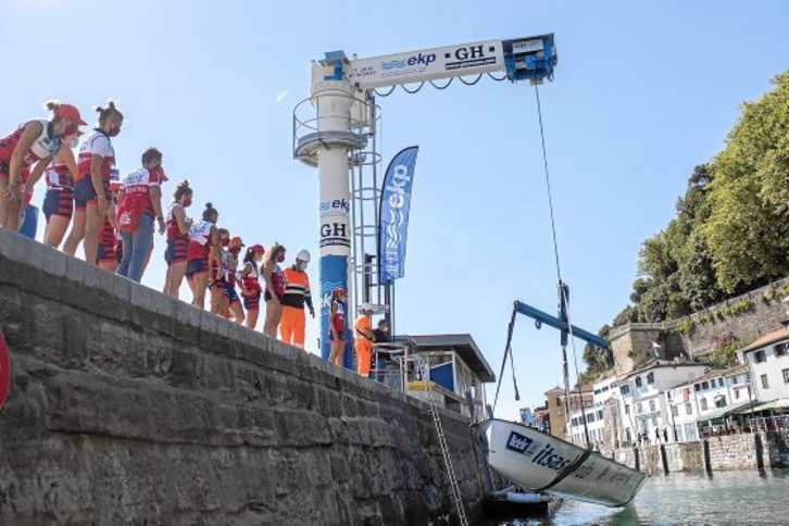 La tripulación de Ondarroa sigue atentamente las maniobras de la grúa que deposita su embarcación en las aguas del muelle donostiarra. De ello se encarga EKP (Euskadiko Kirol Portua), que colaboran desde hace años en la logística, poniendo la infraestructura para que las traineras lleguen al mar de forma más fluida, como se puede ver en esta imagen de la clasificatoria femenina. Otra forma de acceder al agua, evitando las aglomeraciones, tan habituales y hermosas en el remo e imposibles en estos tiempos de coronavirus en los que los títulos se deciden casi en la intimidad. Precisamente EKP, que ya patrocinaba la Bandera femenina de La Concha, en esta edición ha ampliado su colaboración puesto que también contribuye a la Bandera masculina. Esta entidad de carácter público, que se encarga de gestionar las dársenas y puertos deportivos de la CAV, lleva años participando en la organización y esponsorización de distintas disciplinas náuticas. «Desde 2013 hemos apoyado la presencia de la mujer en el remo en la Bandera de La Concha, procurando reforzar el plan de igualdad e intentando darles visibilidad también en otros deportes náuticos como la vela», asegura su directora, Edurne Egaña. Si no hay imprevistos de última hora, ella será hoy una de las pocas personas que vea de cerca la cara de los dos patrones ganadores cuando les entregue el trofeo. Un detalle del sponsor general, en un barco con acceso restringido.